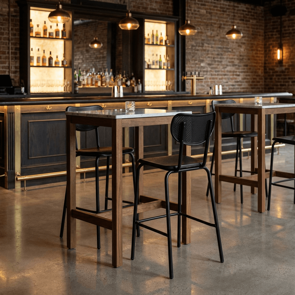 Banco alto para barra con asiento y respaldo de polipropileno antiderrapante y estructura metálica, ideal para espacios modernos como barras de cocina, bares y restaurantes. Su diseño estilizado y ligero facilita la limpieza y movilidad sin sacrificar la estabilidad.