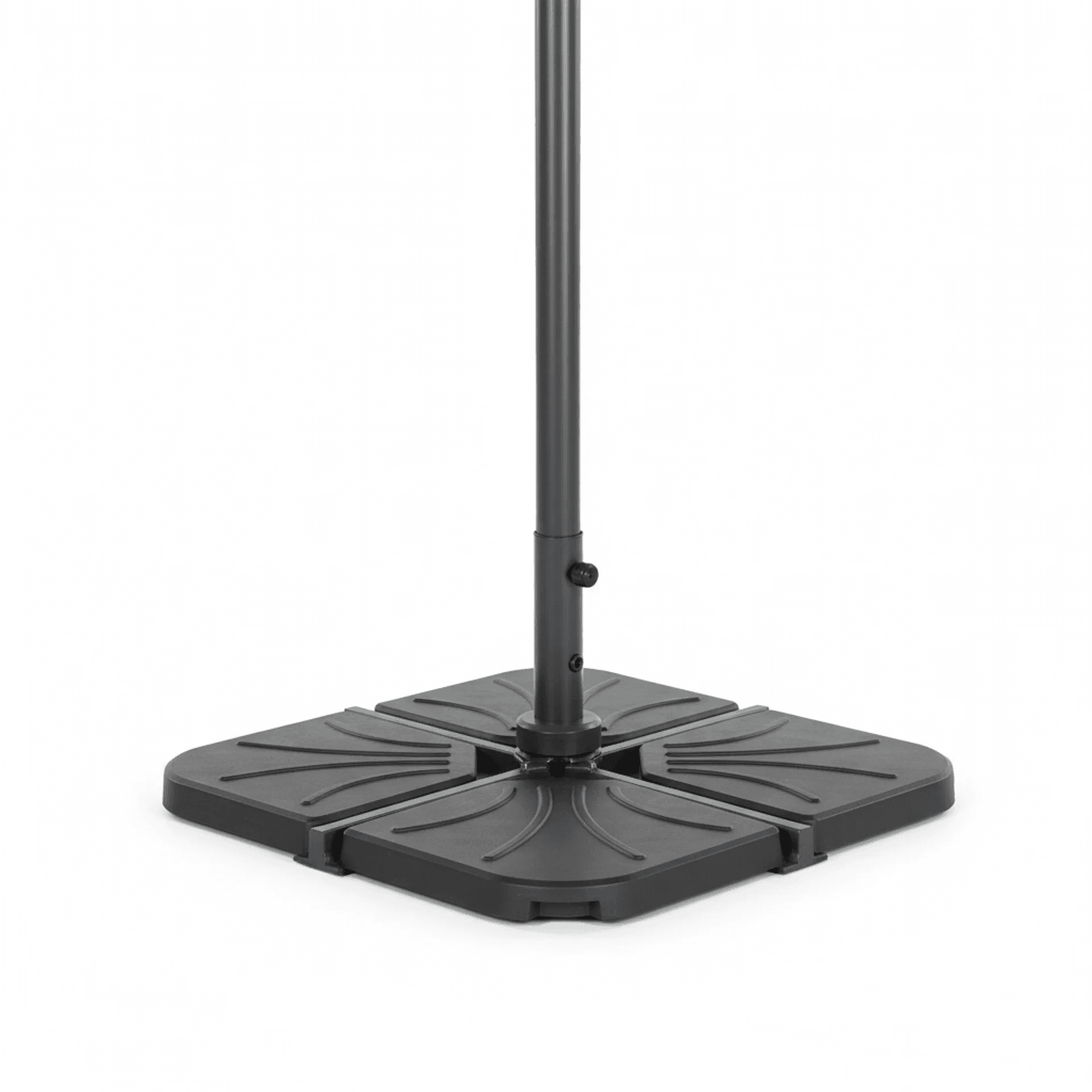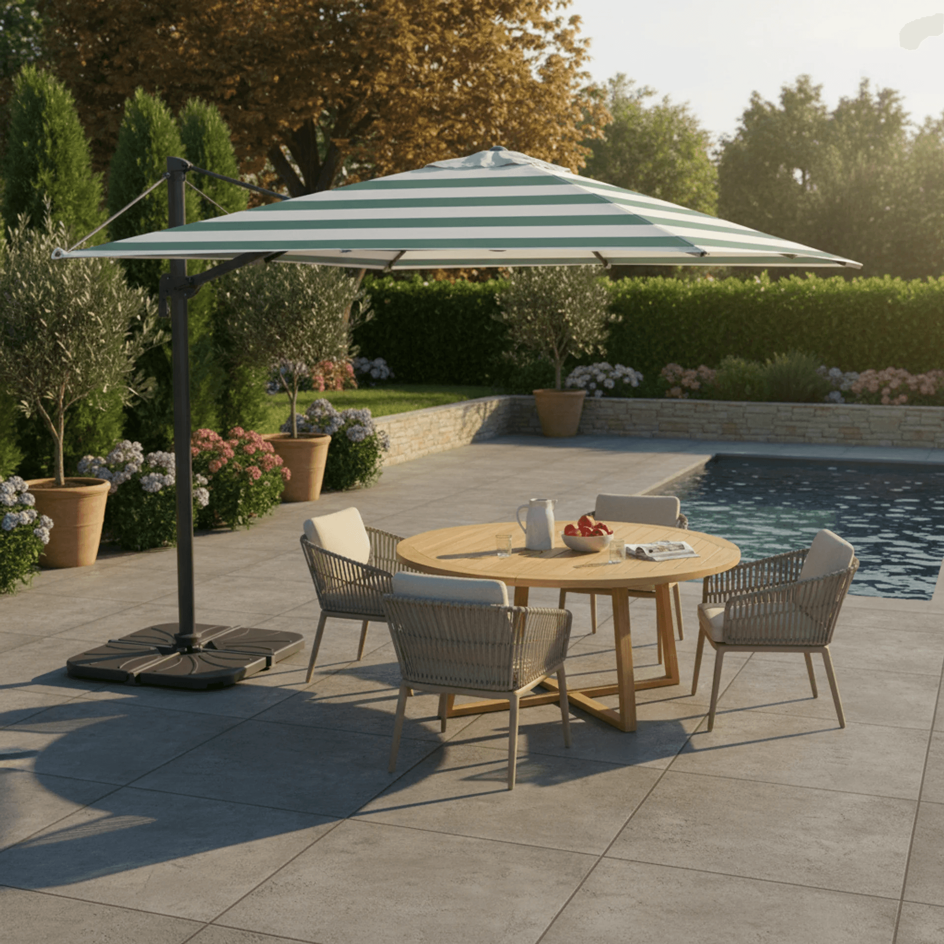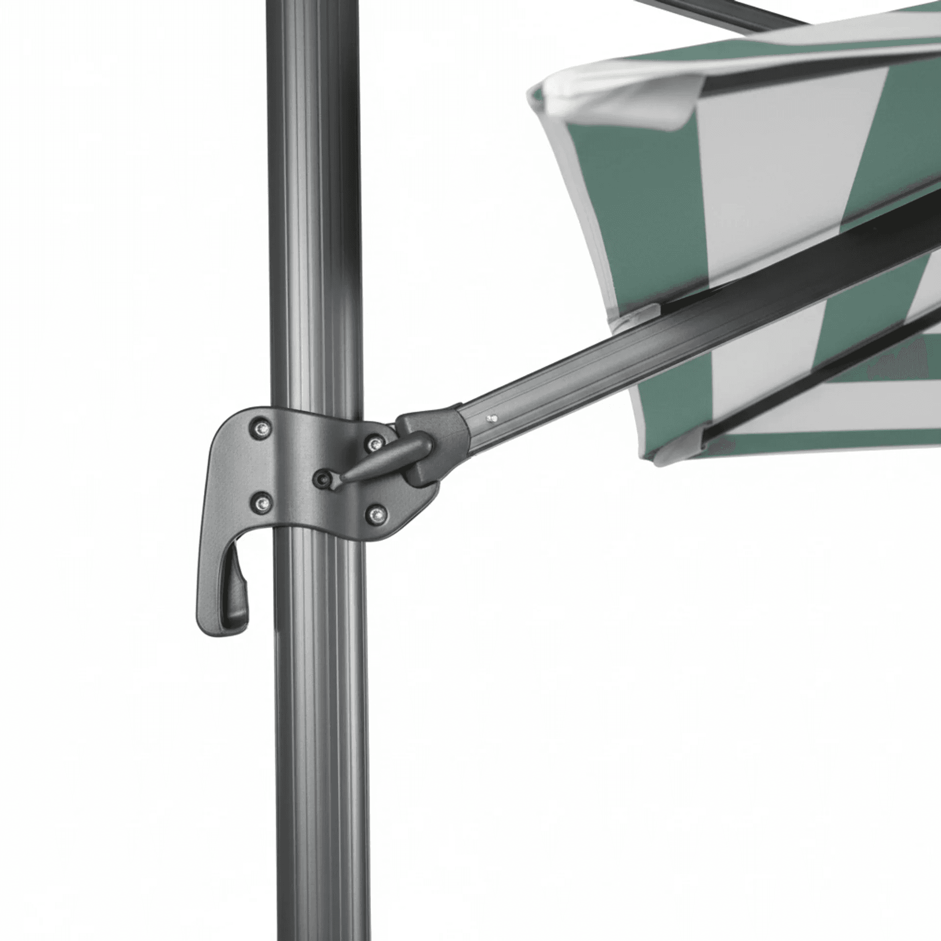 Parasol de aluminio con mástil lateral e inclinación ajustable, con sistema estabilizador y fugavientos.