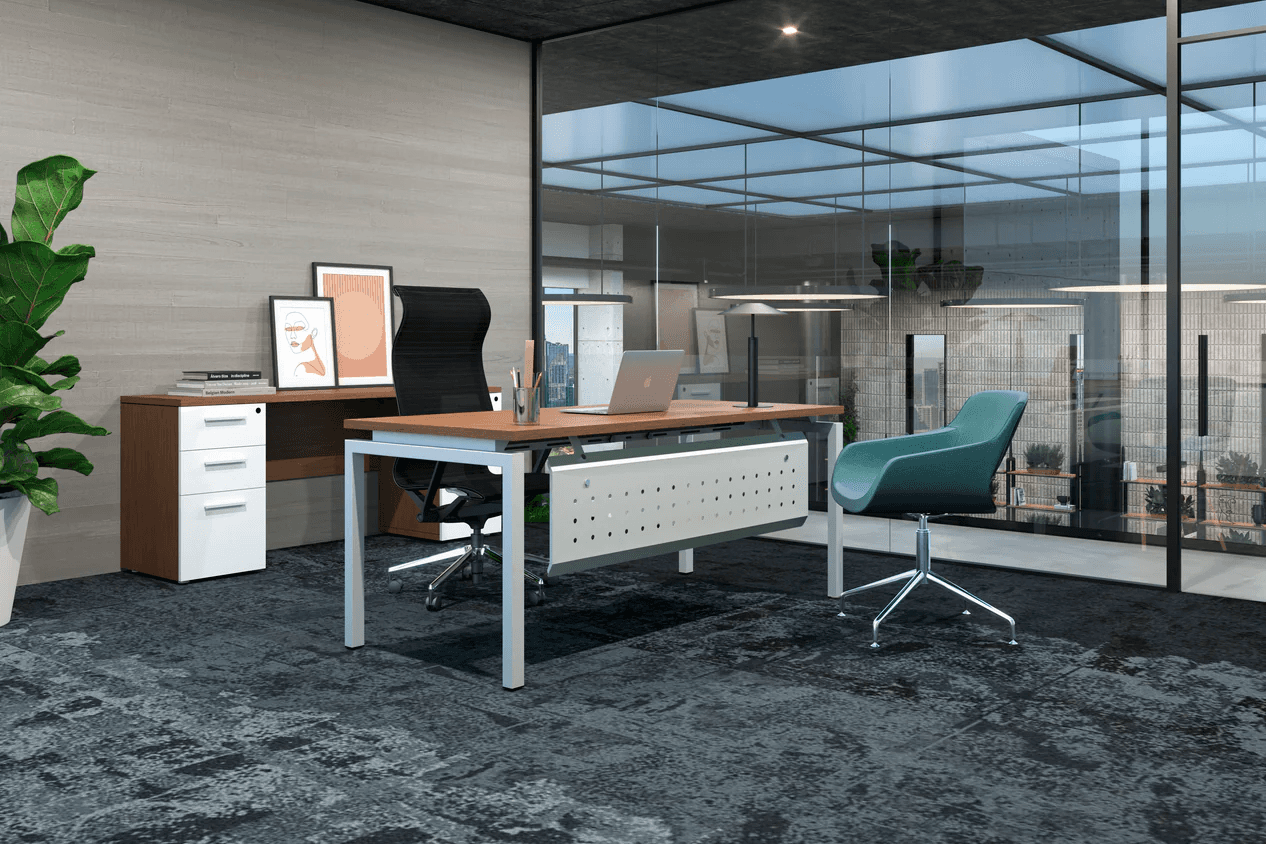 Escritorio ejecutivo de diseño moderno, ideal para oficinas que buscan funcionalidad y estilo. Ofrece una superficie amplia de trabajo y una estructura resistente, pensada para el uso diario en ambientes profesionales.