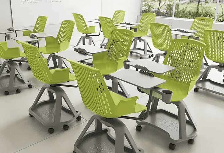Silla escolar con paleta giratoria 360°, respaldo medio para soporte lumbar, ruedas dobles, soporta 130 kg (normas ANSI/BIFMA).
