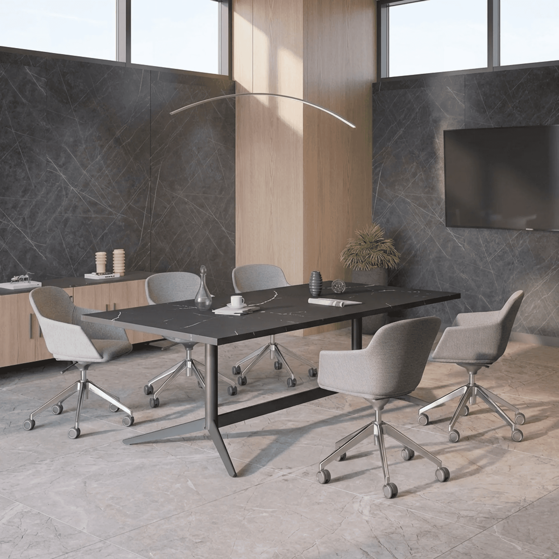 Stella es una mesa versátil y sofisticada, ideal para espacios que buscan funcionalidad con un diseño elegante, destacando por su base en acero inoxidable y acabados contemporáneos.