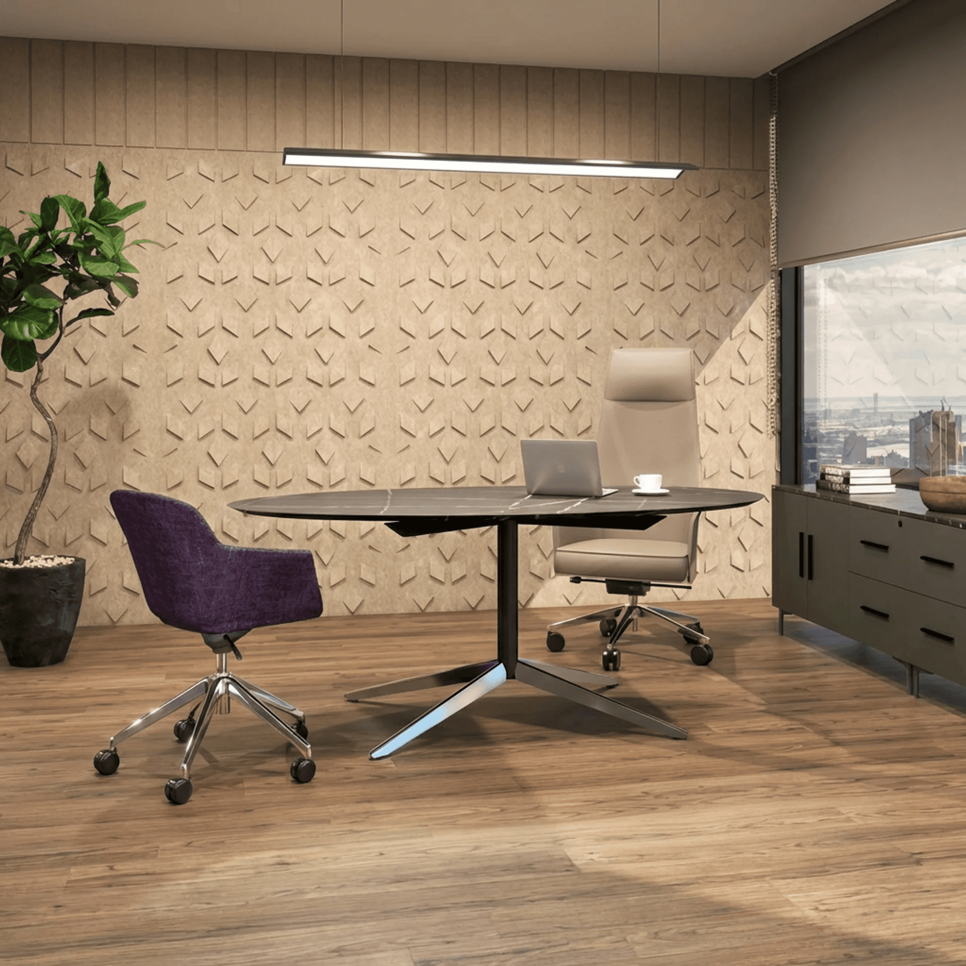 Mesa Stella de silueta ovalada y estructura estilizada, ideal para espacios que buscan versatilidad y sofisticación. Su diseño contemporáneo aporta armonía y carácter al ambiente.