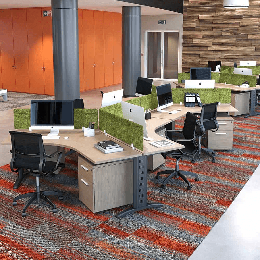 Escritorio operativo para 3 usuarios, diseñado como estación de trabajo colaborativa con cubiertas en forma de boomerang y mamparas divisorias.